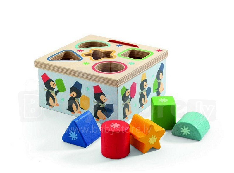 Didaktička igračka Geo Junzo Djeco- lijepa drvena kutija ilustrovana pingvinima idealna je igračka za aktivnosti za razvoj koordinacije i rad finih motoričkih vještina, te će promovirati učenje novih stvari, oblika i boja.
