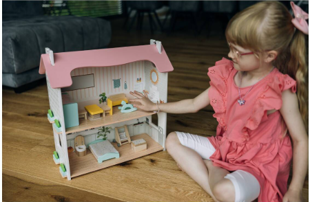 • Uključeni pribor: sto, 2 stolice, sofa, kutija za igračke, kolica, konj za ljuljanje, krevet, krevet na kat, kada, wc.