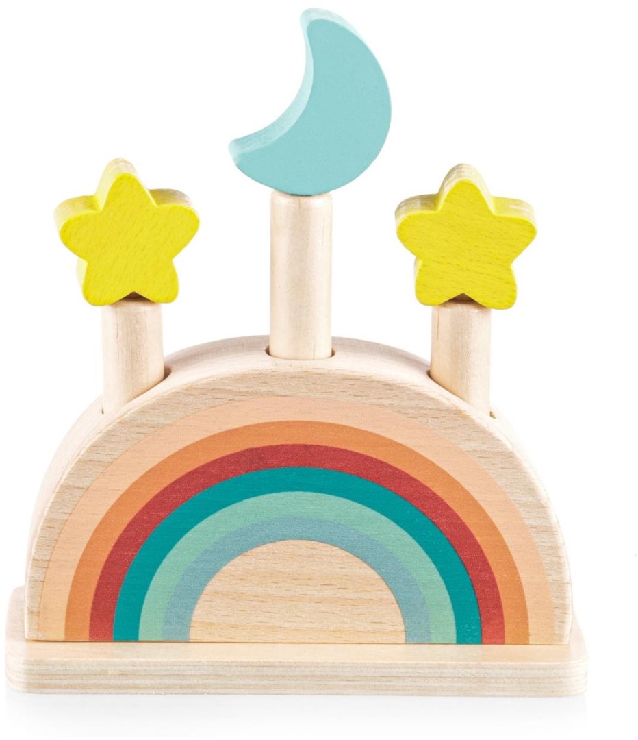 Zabavljajte svoje dijete satima uz pomoć drvene igračke koja se otvara. Četiri šarena klina učvršćena su u šarenu drvenu podlogu s oprugama. Kada se ovi klinovi lagano stisnu, otpuštaju se i opruga ih pušta da iskoče. Igračka razvija motoričke sposobnosti, koordinaciju i koncentraciju, što je čini idealnom za rano učenje. Izrađen od prirodnog bukovog drveta.